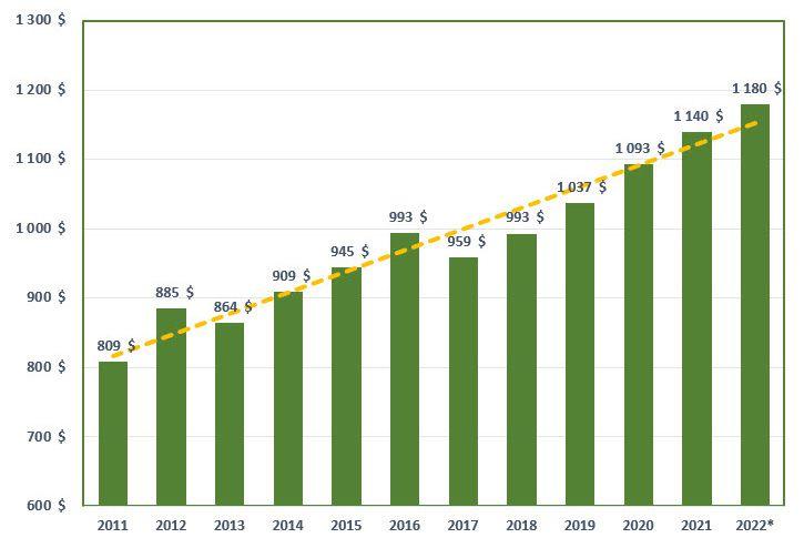 Selon le calcul effectué par Louis Dupuis, économiste forestier (p.14), les entrepreneurs forestiers ont subi une inflation de 7,56 % en 2021 et elle les prévisions laissaient présager une autre hausse de 10,41% en 2022. Cette hausse pourrait être encore plus grande étant donné les plus récentes données économiques.