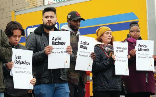 Protesters hold signs in front of Ontario Premier Doug Ford’s office, recognizing the five temporary workers who died at Fiera Foods over the last 20 years.
