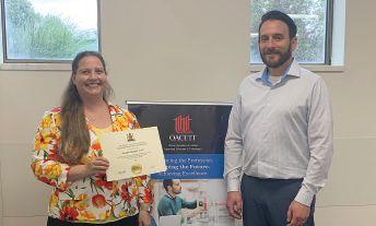 Kendra Shurgold, C.E.T. (left) holds 25-year OACETT milestone certificate, presented by Marco Fernandes, C.E.T., chapter chair.
