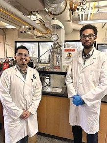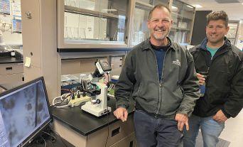Brian Felhaber (left) and Yanick Beaudin, C.Tech. (right) look at