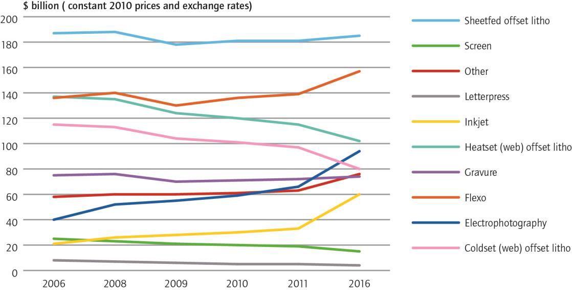 The report concludes the proportion by value of digital print that is variable refuses to rise. In 2013, 19 percent of the printers then using digital print reported more than 25 percent of their digital print was variable, while the figure for 2016 is 18 percent. “As variable data is the major added value component of digital printing, this is an alarming trend.”