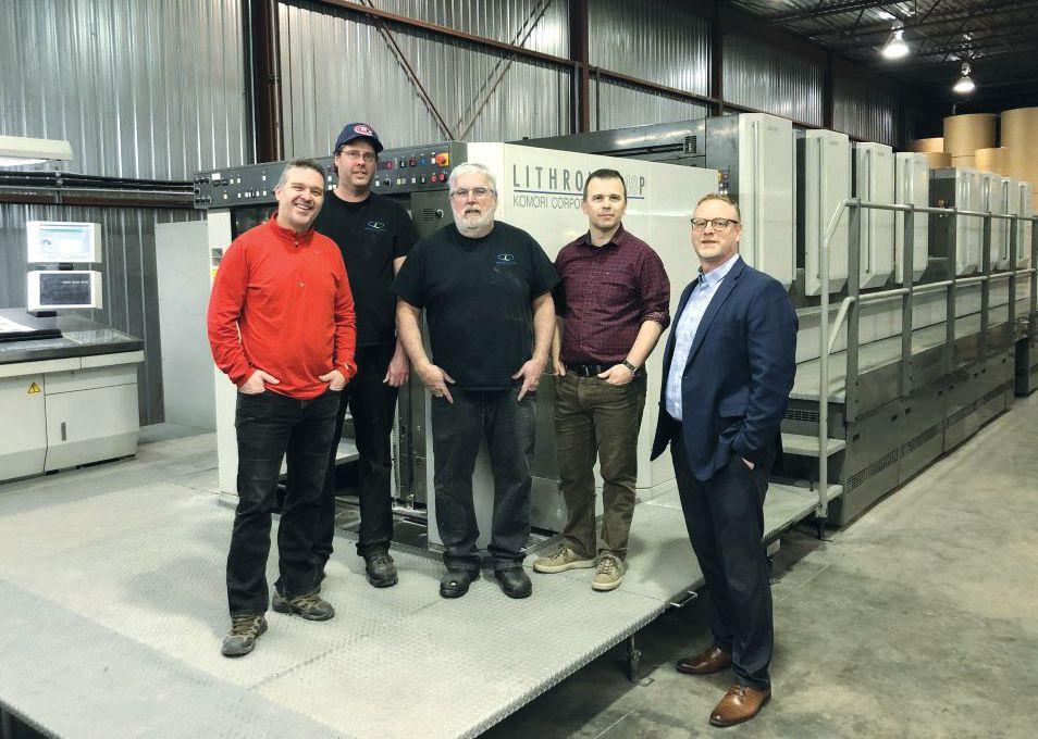 Imprimerie Héon & Nadeau of Victoriaville, Que., has installed a Komori LS 8-colour 40-inch perfecting press purchased from Komcan Inc. (L to R): David Héon, Michel Larivee, Charles Boisvert and Charles Héon with Brett Rogers of Komcan.