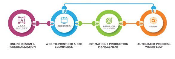 orders whether through an online store or via a mobile device on a sales call. Pricing information is then pushed automatically to Pressero, a private B2B and public B2C online storefront, which instantly updates pricing for items in your storefronts. When there is a price change for raw material, labour or equipment in PrintJobManager, this change will automatically update within Pressero storefronts. Also when an order is placed in Pressero, it is automatically pushed into PrintJobManager, helping users manage job production, including time-tracking capabilities. Within Pressero, users call sell standard or off-the-shelf items, custom items via either the built-in eDocBuilder online design templates or customer supplied artwork. Fulfilling orders from finished goods, including tracking inventory levels, is also supported.