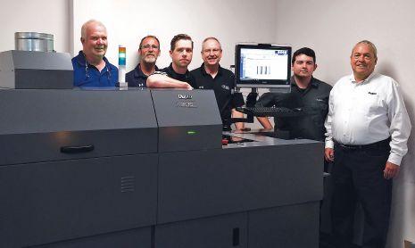 Pictured, from left to right: Joe Kroh, Scott Nehrkorn, Justin Habicht, and Gary Habicht from Printing Specialist; Jake Gandara and Bill Lagarde from Duplo USA.
