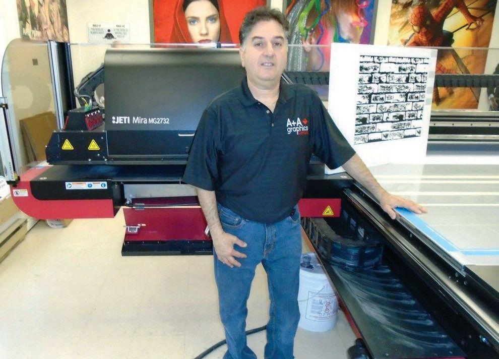 A+A Graphics Canada of Toronto has installed an Agfa Jeti Mira MG 2732/HS, pictured with Ara Sahakian, who recently moved his operation into a larger 15,000-squarefoot production facility. The Jeti Mira reaches speeds of up to 231 square metres per hour via its dockable roll-to-roll extension.