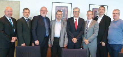 At the contract signing in Bratislava: from left to right.: L. Kovacik (manroland Czech Republic), S. Zapf (manroland web systems), P. Kosik (Production Director SG), A. Tuharsky (Chairman of the Board SG), J. Aumiller (manroland web systems), R. Rosskopf (CEO SG), L. Ciklamini (Technical Director SG), and K. Polakovic (Technical Service).