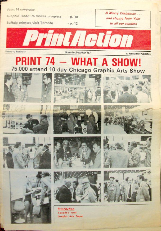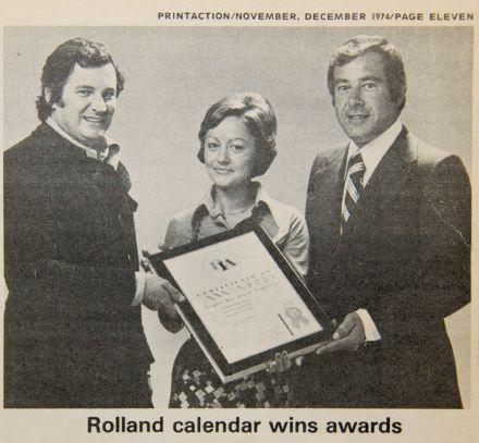 Displaying the latest award taken by Roland Paper’s 1974 “visual pun” calendar are members of the wining design and production team. The 14-page, full-colour calendar, which features fruits and vegetables in humourous photo art situations, was produced by Rolland to demonstrate the excellent colour reproduction capabilities of its surface-treated printing papers.
