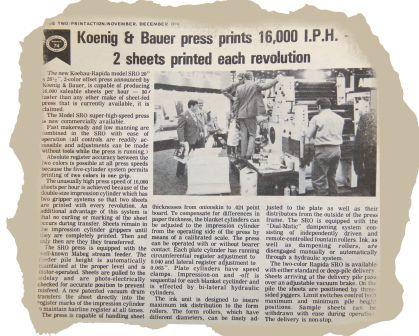 The latest Koenig & Bauer development is the Super-Rapida Series, an offset press that prints at 16,000 impressions per hour. The new 2-colour Koebeau-Rapdia model SRO (20 x 28 1/2-inches) offset press is capable of producing 16,000 saleable sheets per hour – 50 percent faster than any other make of sheetfed press that is currently available, it is claimed. The unusually high press speed of 16,000 sheets per hour is achieved because of the double-size impression cylinder, which has two gripper systems so that two sheets are printed with every revolution.