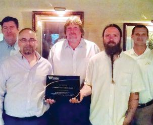 Winston Packaging of North Carolina was recognized by KBA for what the German press maker describes as a “world job production record,” celebrated by Winston’s (left to right) James Gordon, President; Clifford Bullin, Press Operator; Kevin Southern, Pressroom Superintendent; David Nelson, Press Operator; and Vic Tedder, Plant Manager. Running on a 41-inch, six-colour KBA Rapida 106 press, the company reached average speeds of 18,964 impressions per hour on 127,625 sheets (29.5 x 41.5-inch paperboard) in less than seven hours. The KBA Rapida was installed in late 2012. Winston is a fourth-generation family-owned company founded in 1911 in downtown Winston-Salem.