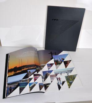 Production: This 2,000-piece run on a MAN Roland 700 UV press, using Topkote Dull cover and Cougar Smooth text papers, featured CMYK plus Match Copper, Match Grey and Match fluorescent. For finishing, the cover sheet includes sculpted multi-level emboss, register cooper and black foils. Text pages were signature sewn, gathered, end leaves tipped on. Cover board was mounted to end leaves, leaving release on spine so lay-flat functionality is intact. It was three knife trimmed to create clean edges. MET explains the primary challenge was creating the lay-flat functionality with no hinge score on covers, retaining incredibly deep multilevel sculpted emboss/foils on cover with clean face trims revealing white board cover material.