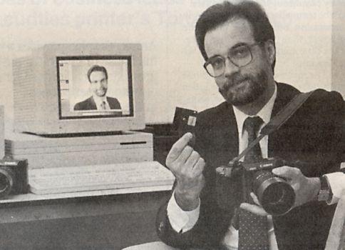 Author Douglas Rea shows the Canon PC still video camera, Macintosh computer and still video floppy disk used in the recent experimental work on electronic photography