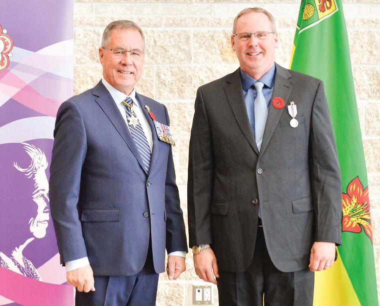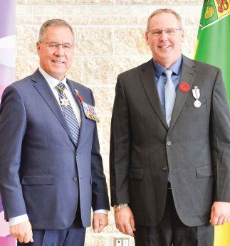 Russ Mirasty, Lt. Gov. of Saskatchewan, with Roy LaBuick, co-owner, Minuteman Press, Moose Jaw, Sask., at a ceremony where Roy was awarded the Queen Elizabeth II Platinum Jubilee Medal.