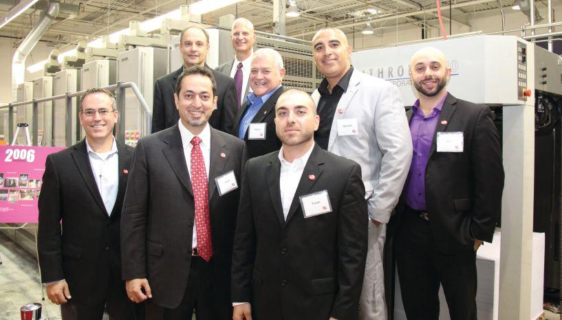 With the new 6-colour Komori S40 in Mississauga are: (back row, L to R) Eric Findon, Director of Customer Experience; Paul Kett, Plant Manager; (middle row) Robert Godwin, Director of Business Development; German Rameriz, Director of Print Operations; Arby Tatavossian, Business Development; (front row) Preston Herrin, VP of Marketing and Sales; CEO Zarik Mergerdichian; and Todde Kamali, Business Development.