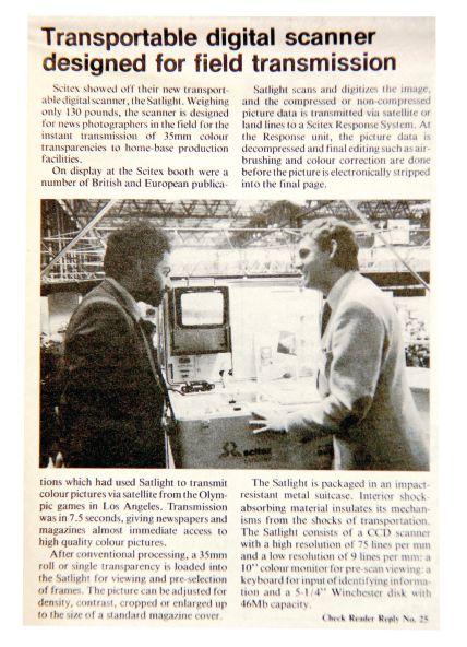 Scitex showed off its new transportable digital scanner, the Satlight. Weighing only 130 pounds, the scanner is designed for news photographers in the field for the instant transmission of 35-mm colour transparencies to home-base production facilities. Recently, a number of British and European publications used Satlight to transmit colour pictures via satellite from The Olympic Games in Los Angeles. Transmission was 7.5 seconds.