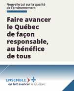 Le gouvernement du Québec a officialisé l’entrée en vigueur de la nouvelle Loi sur la qualité de l’environnement (LQE) le 23 mars dernier, laquelle inclut un nouveau régime d’autorisation environnementale fondé sur le niveau de risque que représentent les projets (élevé, modéré, faible ou négligeable). Se voulant une réforme en matière de respect de l’environnement, le lancement de la LQE a été marqué par l’instauration du Règlement sur les aqueducs et égouts privés (RAEP). Ce Règlement poursuit notamment les objectifs d’alléger les obligations des administrateurs de tels réseaux; de favoriser l’autonomie de leurs gestionnaires; ainsi que de mettr e en oeuvre des mécanismes pour favoriser l’entente entr e les responsables et les personnes qui bénéficient des ser vices. Tous les détails au mddelcc.gouv. qc.ca/lqe.