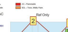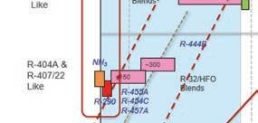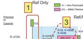 déplaçons vers la gauche dans la boîte 2, aucun frigorigène de climatisation n’est répertorié. Dans la boîte 3 –l’étape suivante – nous pouvons voir le R-32, le R-452b et le 454b. Certains de ces frigorigènes (sur fond rose) sont A2L ou légèrement inflammables », a-t-il fait savoir.