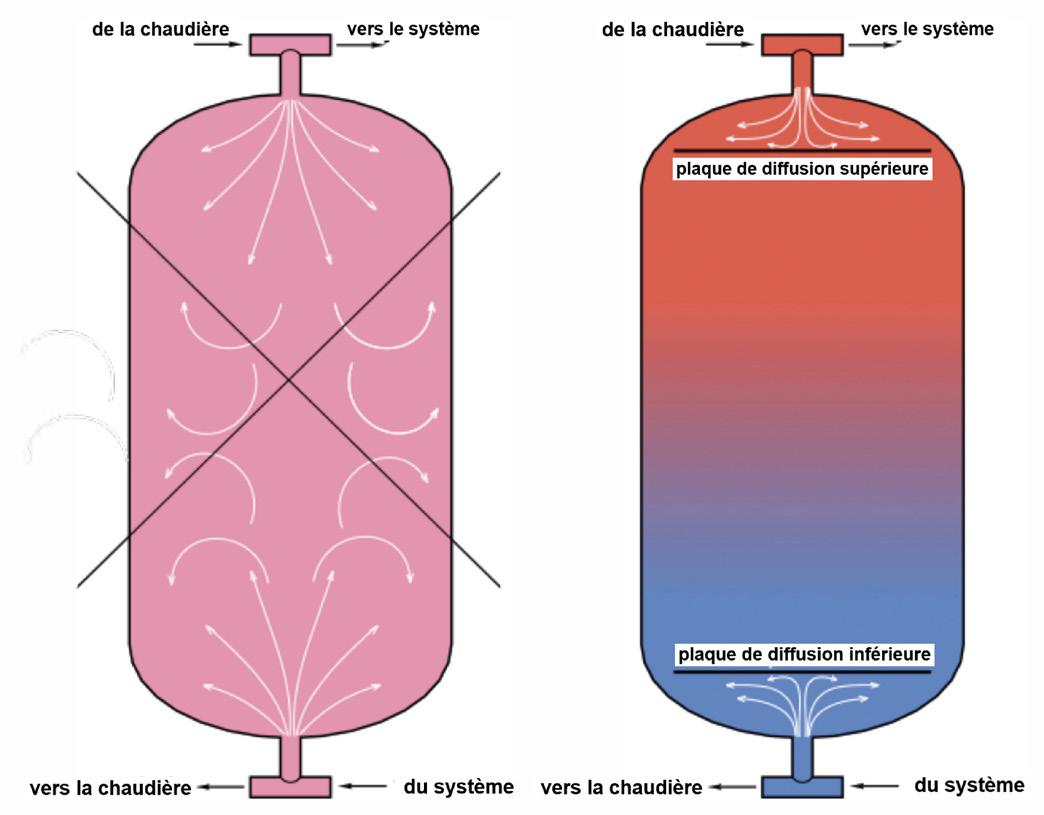 utilisant des sources de chaleur renouvelables, nécessitent des réservoirs de stockage thermique de grande dimension. En outre, il ne suffit pas de sélectionner un réservoir du volume et de la pression nécessaires. Pour préserver une stratification bénéfique à l’intérieur du réservoir, il est très important que l’écoulement y pénètre de manière à empêcher la création de courants verticaux dans l’ensemble du réservoir.