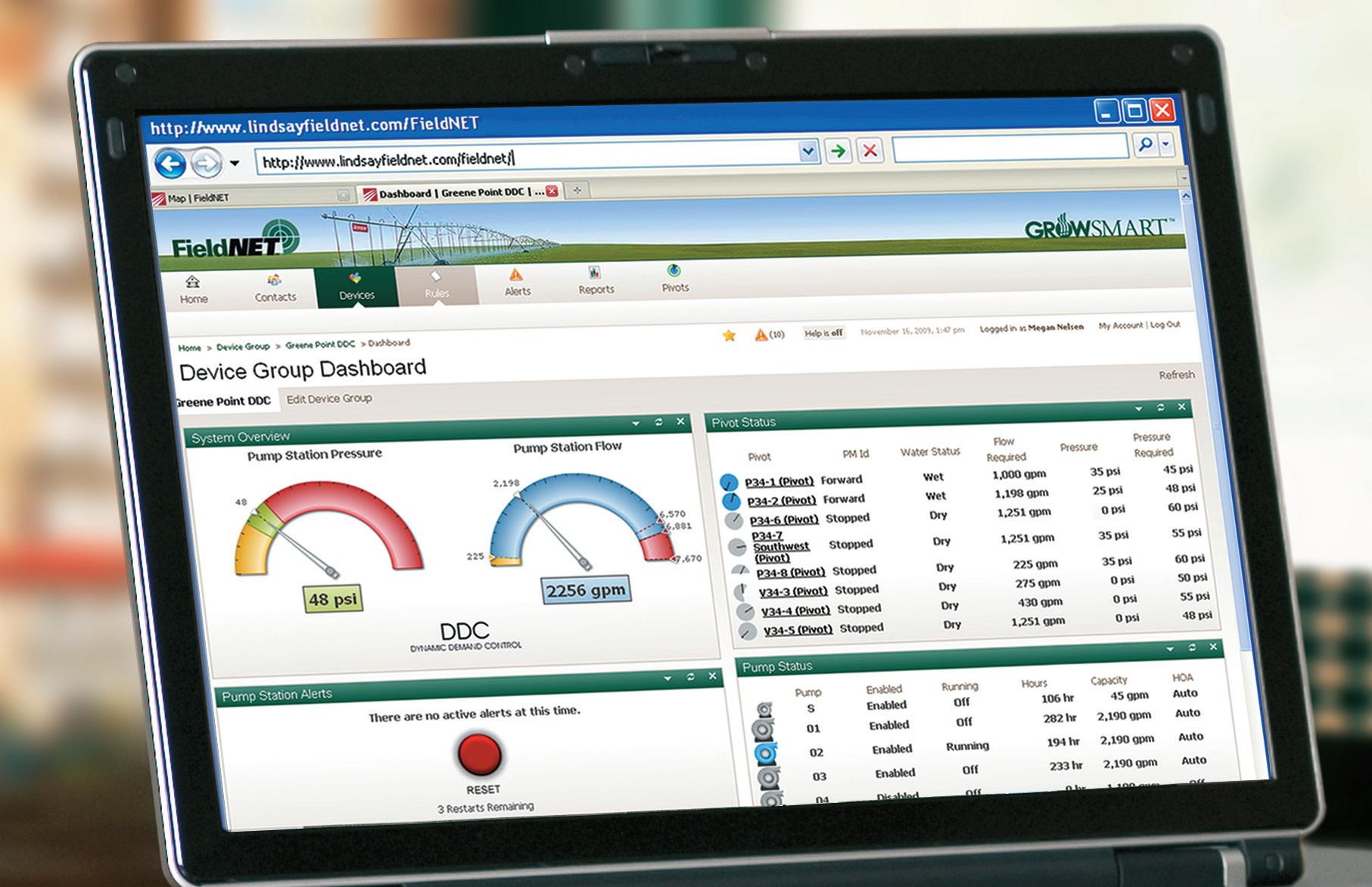 Lindsay Corporation, maker of Zimmatic irrigation systems, announces the addition of pump control to its awardwinning FieldNET web-based irrigation management system. With this addition, growers will be able to access a single online portal to monitor and control their entire pump and centre pivot irrigation system.