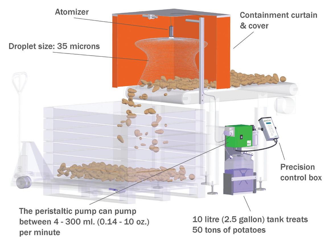 “Moisture is such a big issue in this industry and we think we have a solution,” comments Stam. “There is a lot less waste using this system, which offsets the initial set-up cost because product will be going on the potatoes and not running off.” He says potato producers can expect to pay between $4,000 and $4,500 for an initial system.
