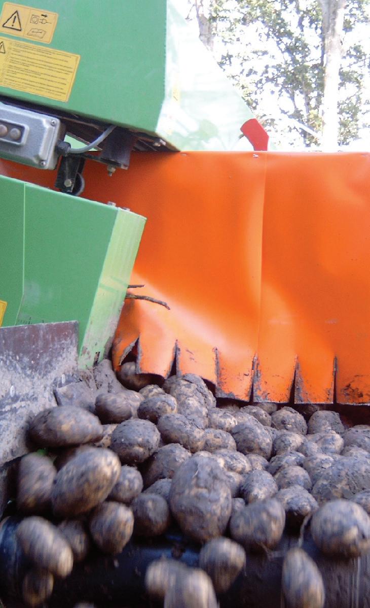 Dr. Bohl says to position the blade and primary nose cone rollers so the potatoes flow onto the upper surface of the conveyor rather than bumping into the front. “Blade designs should be matched to the soil type, soil condition, the presence of other plant roots and the depth of the tubers,” he explains. “When choosing a conveyor chain, choose one that suits your soil and operating conditions.” He says belted chains cause the least damage, but they eliminate less soil than other chains.