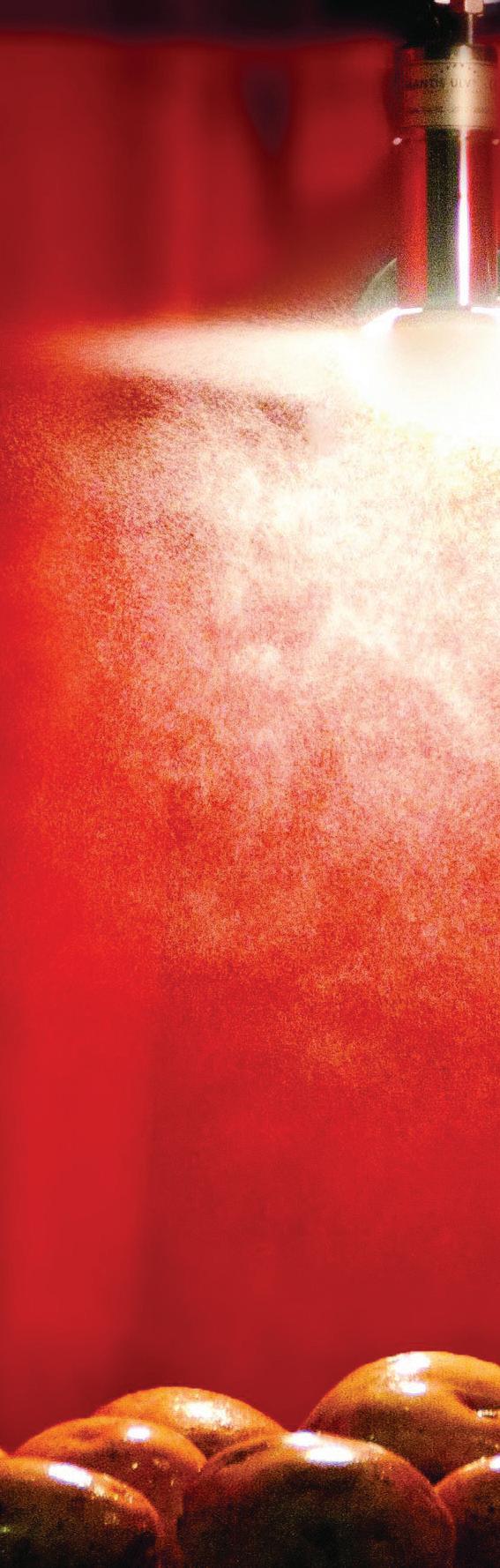 The Mafex operates on a system of centrifugal force using a rotation disc that distributes roughly 30 million droplets per millilitre of liquid. The droplets are deposited uniformly through a vertical air stream, the workings of the disc and the movement of the potatoes on the belt.