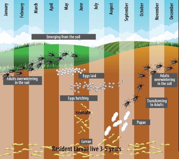 Wireworms are the soil-dwelling larvae of beetles in the Elateridae family, called click beetles. Canada has about 30 wireworm species of economic importance. In most species, the beetles lay eggs in the soil in the spring. A few weeks later, the larvae hatch. The larval stage lasts about four or five years, depending on the species. Then the larvae pupate and emerge from the soil as adults in the spring.