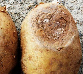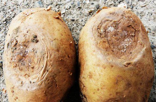 foliar symptoms, he says, but in three susceptible varieties (Yukon Gold, AC Chaleur and Envol) it can cause necrotic tuber lesions or rings that can make the entire crop unmarketable.