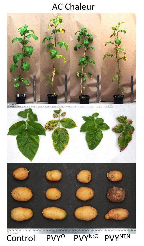 There are currently three types of PVY in Canada: PVYO and two newer strains, PVYN:O/Wi and PVYNTN . Singh says the study has confirmed that the newer, more necrotic strains are displacing PVYO in several important potato-growing provinces. Necrotic symptoms can cause tubers to rot, leading to losses in both yield and quality.