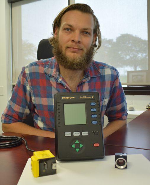 ABOVE: Weed scientist Andrew McKenzie-Gopsill with digital camera, sensor and controller mechanism that can be mounted on a sprayer and tractor to read crop plant locations.