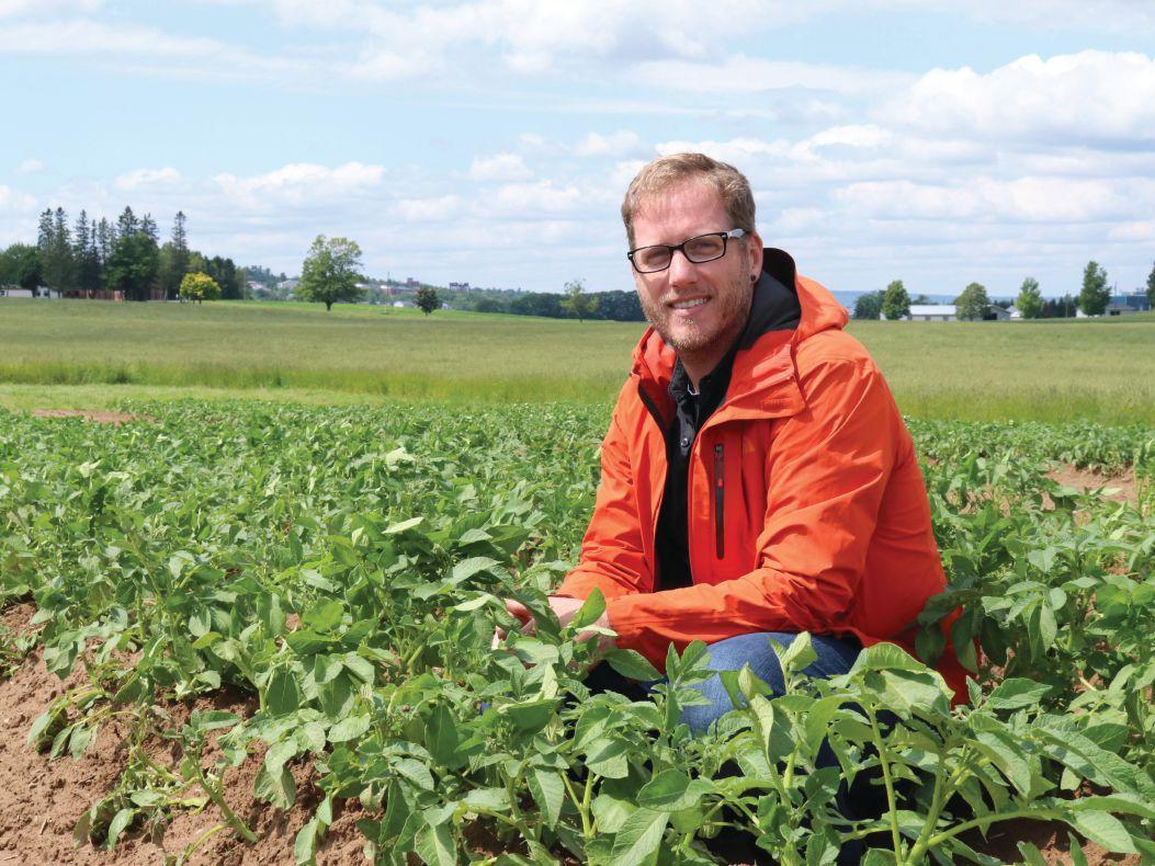 ABOVE: Sheldon Hann, a biologist with Agriculture and Agri-Food Canada, checks the health of potato plants grown with nurse crops.
