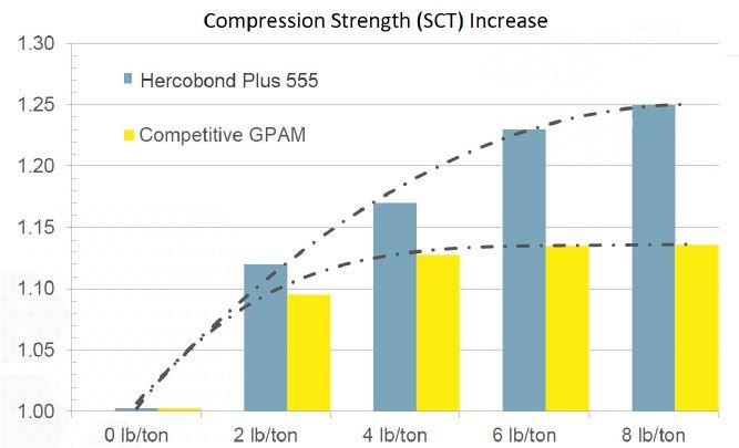Solenis can now provide a system for generating GPAM onsite at a mill. Results were presented from a recent trial which showed that GPAM made onsite provides much more efficient dry strength. With a purchased GPAM product, the compression strength reached its maximum at a dosage of four pounds per ton, whereas the onsite generated better strength at the same dosage and additional strength