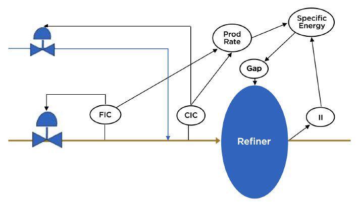 In high-consistency refining for the manufacture of thermomechanical pulp (TMP), which is a much more energyintensive process taking place at 25 to 40 percent consistency, model predictive control (MPC), a form of artificial intelligence, has been successfully applied in closed loop mode for over 20 years. Process variables are used to build a multiple input – multiple output model that controls mainly the pulp consistency and motor load, resulting in the ability to apply a constant specific energy, or tune the specific energy for desired quality parameters. This not only results in reduced quality variation but can enable increased productivity and energy savings. Because of the high amount of specific energy applied in TMP refiners, the energy savings can be significant. For example, if a TMP mill producing 1000 tonnes per day at a total specific energy of 1.5 MWh/tonne is paying 5¢/kWh for electricity, a five percent energy savings is worth about $1.3 million per year.