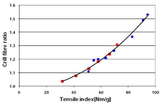 calculated from the ratio of UV/IR transmission losses. Since the mid-2010s, this method has been used for crill detection in an add-on module for the L&W Fibre Tester, as well as in the “Crill Eye” module offered by PulpEye. Crill measurement can thus be used for monitoring fibrillation by the refining process. Recently published research [Kerekes, R.J., McDonald, J.D. and Meltzer, F.P., External fibrillation of wood pulp, TAPPI J, 22(6) 363(2023).] suggests that there is a critical refining intensity, below which external fibrillation occurs and above which fibrils become detached from the fibre.