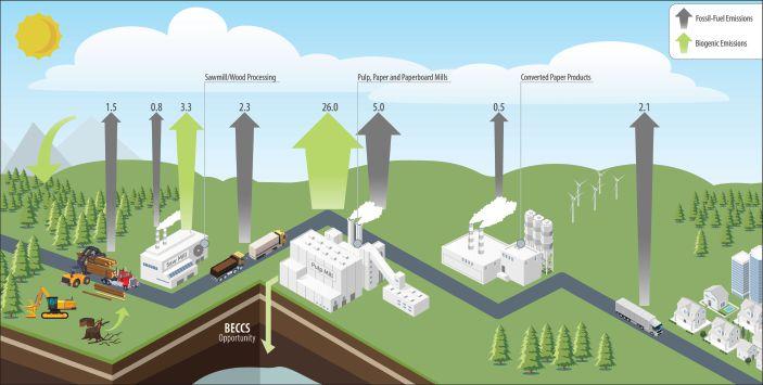 capture from pulp mills has been shown to be feasible but is not currently economically viable at a small scale if no credit is provided for negative emissions or without a market to sell captured CO2. While biogenic emissions are usually reported, they are not priced or subject to regulation under current national carbon policies.