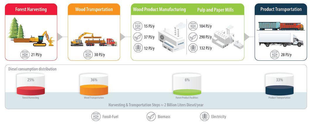 est harvesting to transportation of finished products (Figure 1), has been performed to define the energy profile of the Canadian forest value chain. Data on energy usage and GHG emissions are available through public databases such as the National Energy Use Database launched by Natural Resources Canada in 1991, Canada’s National Inventory Report, and GHG Reporting Program led by Environment and Climate Change Canada. Since these databases focus on energy and GHG data for the pulp and paper sector, information for upstream and downstream operations is less defined. Specific attention was given to estimating diesel consumption.