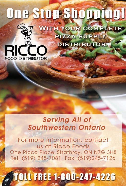 FOR ALL YOUR PIZZA NEEDS... Ricco Food Distributor. Your complete pizza supply distributor, serving southwestern Ontario. For further information and pricing details, call Don Windsor at 1-519-245-7081 or fax 1-519245-7126.