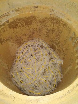 At the Freshwater Institute, packing media is threaded onto water-proof nylon rope prior to installation. The rope allows removal of the media from the top of the CO2 stripping column without the need for scooping or entering the column to reach the bottom. The rope also prevents loose media from falling into tanks or sumps causing downstream plugging and operational issues.