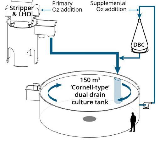 If a pumped velocity assist system is utilized, a DBC could be integrated and allow optimization of both tank water velocity and oxygenation. This approach would save energy as both the supplemental oxygen and velocity assist would not need to be operated until the biomass and fish required it.