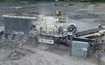 The 400 hp (300 kW) crusher motor provides superior crushing. The TI5064 impact crusher features a massive rotor with quick-change impact bars, supported by a high-strength, high-inertia four-bar rotor assembly. Material input is managed by the 60-inch by 20-inch VGF6020 vibrating grizzly feeder. The removable AR400 feed