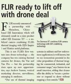 thermal camera applications, had formed a deal with China-based DJI Innovations resulting in the creation of the DJI Zenmuse XT — a joint product featuring FLIR’s thermal imaging technology and DJI’s aerial platform. Andrew Saxton, a FLIR director, remarked that the technology was well suited to perimeter protection and quick response to emergency situations.