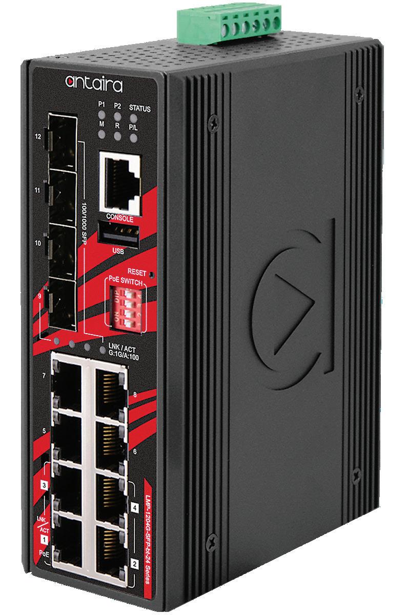The LMP-1204G-SFP-bt-24 is a fully manageable Light Layer 3 Ethernet switch pre-loaded with a web management console design. It supports the ring network redundancy function using the open standard ITU-T G.8032 ERPS protocol with <50ms network recovery time. Advanced network filtering and security functions — such as IGMP, VLAN, QoS, SNMP, RMON, Modbus TCP, and 802.1X/HTTPS/SSH/ SSL — increase determinism and improve network management for remote SCADA systems or control networks. www.antaira.com