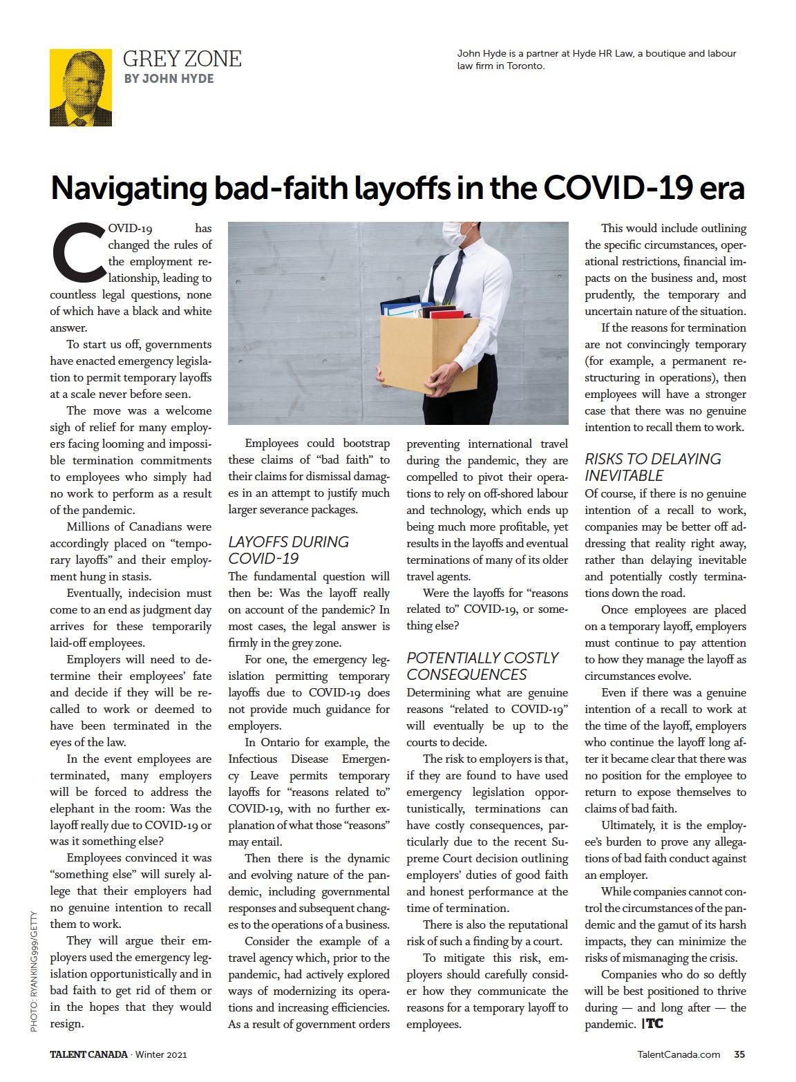Legal suits as a result of off-duty misconduct during the COVID-19 pandemic have altered the way managers enforce health mandates and discipline employees. The Canadian Press reports that during this period, employees are facing career consequences for risky behaviour that would otherwise go unnoticed. The cases reflect the growing issue during the pandemic of whether someone’s behaviour is a risk to their employer’s reputation. Recent cases include a London, Ont., nurse being fired for speaking at an anti-lockdown rally.