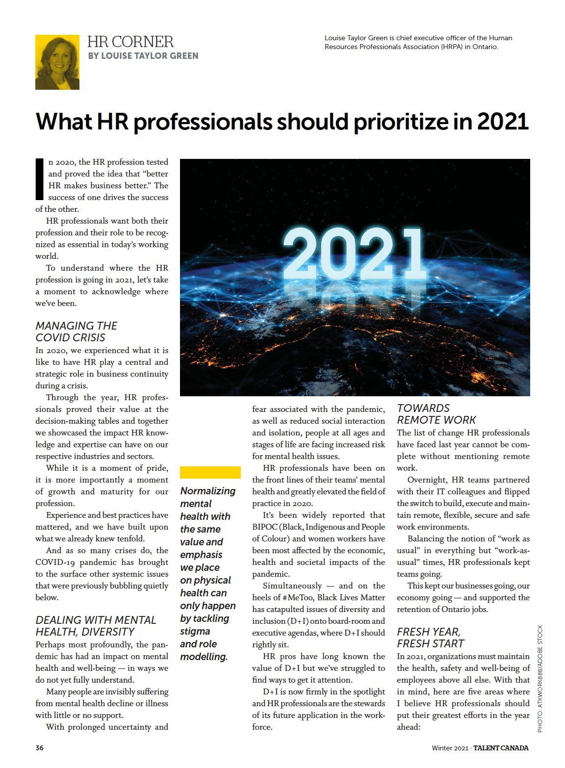In 2021, data will continue to be tracked, best practices will be refined on an ongoing basis, board and executive leaders will increasingly step up and out to embrace D+I, and I expect ongoing enhanced policy expectations will be brought forward by provincial and federal governments mandating greater transparency with D+I reporting.