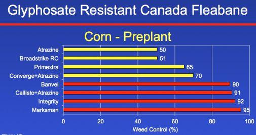 The first experiment that we looked at in corn is what farmers can add to pre-plant burndown to control glyphosate-resistant Canada fleabane. Glyphosate was tank mixed with atrazine, Broadstrike, Primextra, or Converge, and you can see all of those provided less than 70 per cent control. However, Banvel, Callisto plus atrazine, Integrity or Marksman, all provided greater than 90 per cent control. The best treatment was Marksman, which is a combination of dicamba and atrazine.