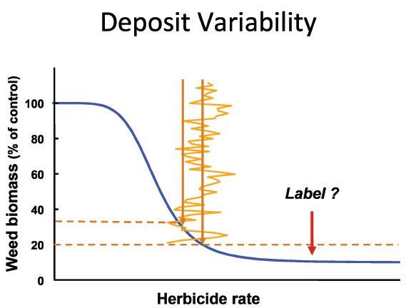 When we analyze the relationship of herbicide performance and dose when the dose is just at the sublethal stage, we see how variability can he a problem. As we enter the sublethal doses, the herbicide response curve assumes a convex shape. At this stage, the benefit from overdosing is much smaller than the penalty from under-dosing. When we superimpose the typical variability in dosing, such as the one from our Ohio State study, we quickly learn that a variable dose is also a less efficacious dose. Perhaps the loss of overall efficacy is enough to cause sublethal doses to reach certain weeds, allowing survival that can eventually lead to polygenic resistance development.