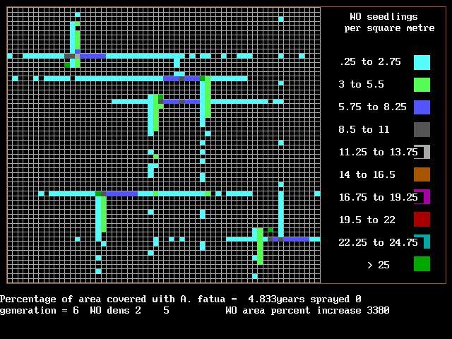 After five years of the model running, the patches with chaff collection had spread out somewhat. With a late harvest and chaff collection the patches hardly got bigger at all. When we harvested without chaff collection, the wild oat dispersal when swathing was much worse. With a late harvest, most seeds fell off and there was much less dispersal.