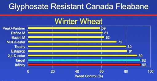 We studied the commonly used broadleaf herbicides in winter wheat in Ontario. Peak, Refine, Buctril, MCPA, Trophy, Estaprop, and 2,4-D ester provided less than 90 per cent control. Target provided 92 per cent control. However, I will never recommend Target for weed control in winter wheat because dicamba in Target is just simply too hard on the crop. We have had up to 25 bushel per acre yield losses where we include dicamba in our broadleaf herbicide in winter wheat. I think we’re down to essentially one herbicide to manage glyphosateresistant Canada fleabane in winter wheat. Infinity (pyrasulfotole and bromoxynil) provided 92 per cent control.