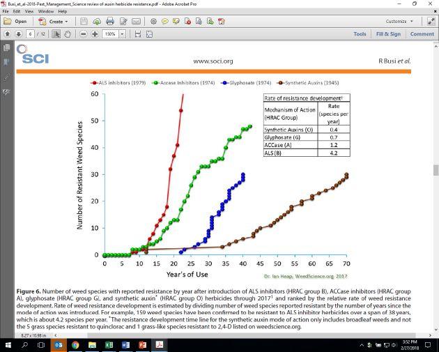 In Australia, wild radish has some populations resistant to 2,4-D, and that certainly has some economic impact. In Europe in cereal production, there is corn poppy resistance to 2,4-D. Recently in South America and Argentina, smooth pigweed has been reported as resistant to both 2,4-D and dicamba.