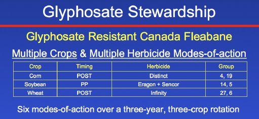 If you implemented those three strategies in a diversified crop rotation of corn, soybean and wheat, you would be using six different modes of action over your three-year, three-crop rotation. I can assure you, with that kind of diversity in your weed management program, you would reduce the selection intensity for glyphosateresistant weeds.