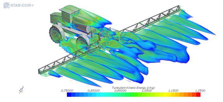 But there are other trends in spraying which are more difficult to correct. One such trend is to drive ever-faster, which creates aerodynamic challenges for uniform spray deposition. The faster the speed, the more fine droplets leave the spray plume and become subject to displacement due to forward motion-induced turbulence. Funded by Western Grains Research Foundation, Hubert Landry with PAMI Humboldt did some modelling of turbulence behind sprayers through “computational fluid dynamics” (CFD). CFD is software that can document, among other things, turbulent kinetic energy – TKE – an indicator of turbulence. At 18 miles per hour travel speed, structural components on the sprayer such as booms and wheels can create significant turbulence.
